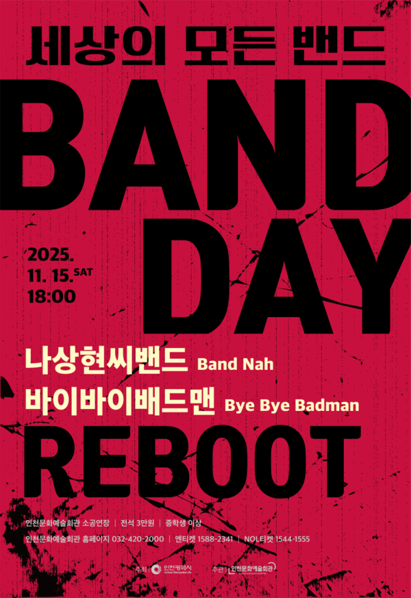 인천문화예술회관 관계자는 “새롭게 단장한 무대 위에서 다시 울려 퍼질 밴드들의 음악이 시작을 두려워하지 않는 모든 이들에게 뜨거운 에너지를 전할 것”이라며 “멈춰 있던 리듬을 다시 켜는 ‘리부트의 순간’을 관객과 함께 나누고 싶다”고 말했다.