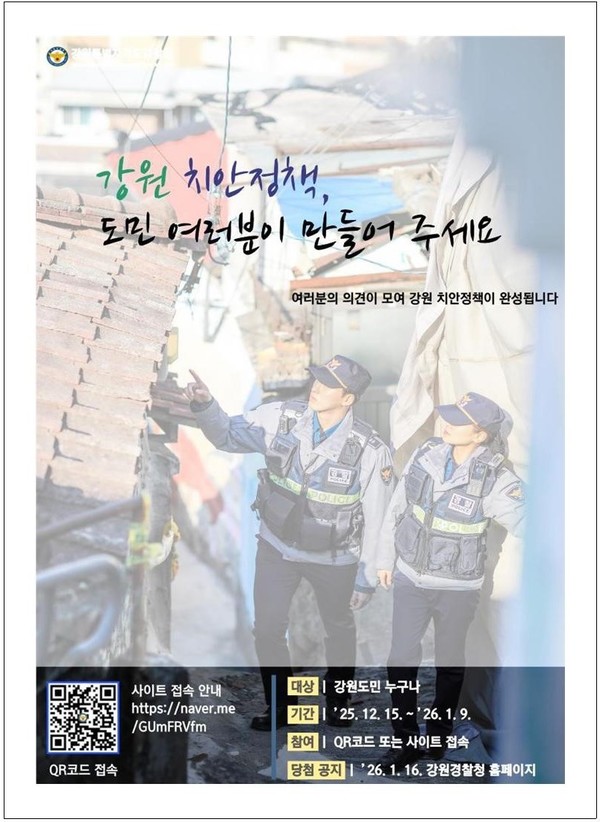 강원경찰청(청장 최현석)은 12월 15일부터 내년 1월 9일까지 4주간 강원도민을 대상으로 '2026년 강원 치안정책 수립을 위한 의견을 온라인으로 수렴한다고 밝혔다.