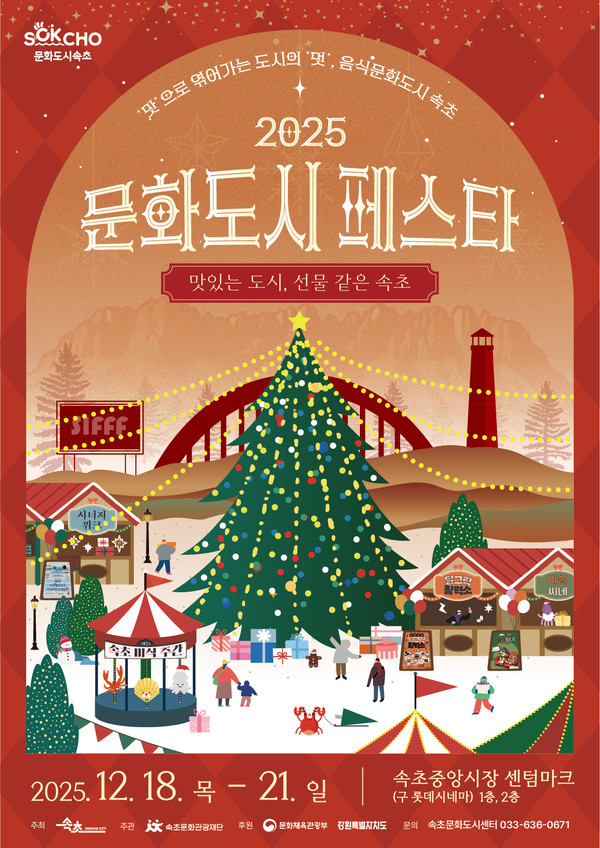 속초문화관광재단(이사장 이병선, 속초시장)은 속초시의 대한민국 문화도시 1년 차 사업을 마무리하며 오는 12월 18일부터 21일까지 속초중앙시장 센텀마크에서 대한민국 문화도시 성과공유회 ‘2025 문화도시 페스타’를 개최한다.