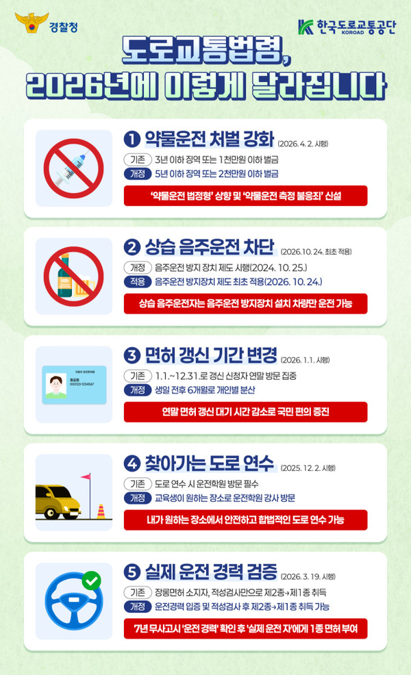 내년부터 약물운전에 대한 처벌과 상습 음주운전자 관리가 대폭 강화되고 운전면허 갱신 및 도로 연수 제도는 불편을 줄이는 방향으로 손질된다. 경찰청은 마약류와 향정신성의약품에 취한 상태의 운전을 강력히 규제하는 한편, 운전면허 제도의 실효성을 높이고 국민 편의를 개선한다는 방침이다.