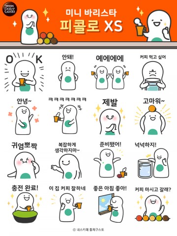 미니 바리스타 피콜로 XS 이모티콘은 일상적인 온라인 커뮤니케이션에서 자주 쓰이는 문구(△OK △안녕 △고마워 △ㅋㅋㅋ)와 피콜로 XS 및 네스카페 돌체구스토 캡슐의 특장점을 연상시키는 문구(△귀염뽀작 △넉넉하지 △이 집 커피 잘하네), 커피를 마시는 것과 관련된 문구(△커피 먹고 싶어 △커피 마시고 갈래? △충전 완료) 등이 포함됐다.