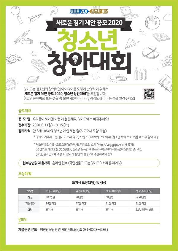 한편, 새로운경기 아이디어 공모 청소년 창안대회는 경기도의 소리, 국민신문고에서 9월 15일까지 접수 받는다.