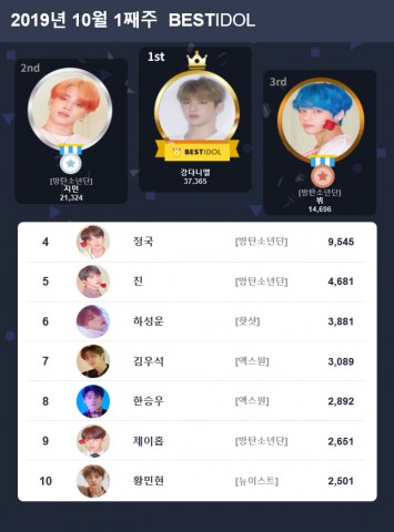 2019년 9월 30일부터 10월 6일까지 진행된 10월 첫째 주 투표에서 강다니엘이 15주 연속 BESTIDOL로 선정되었다.