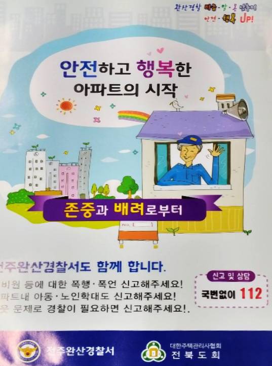 전주완산경찰서와 대한주택관리사협회 전북도회는 지난 8일 ‘안전하고 행복한 아파트의 시작, 존중과 배려로부터’라는 주제로 공동주택 갑질 예방 홍보물을 제작해 배포했다고 9일 밝혔다.